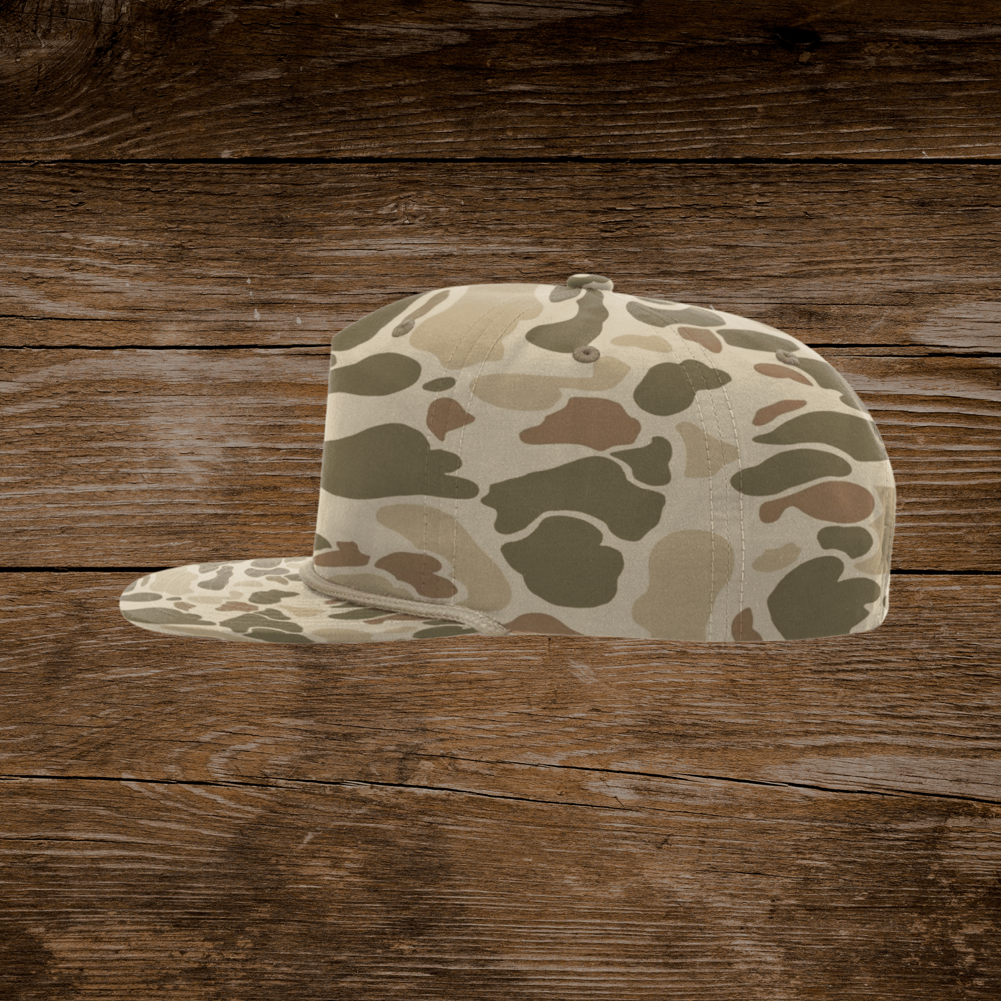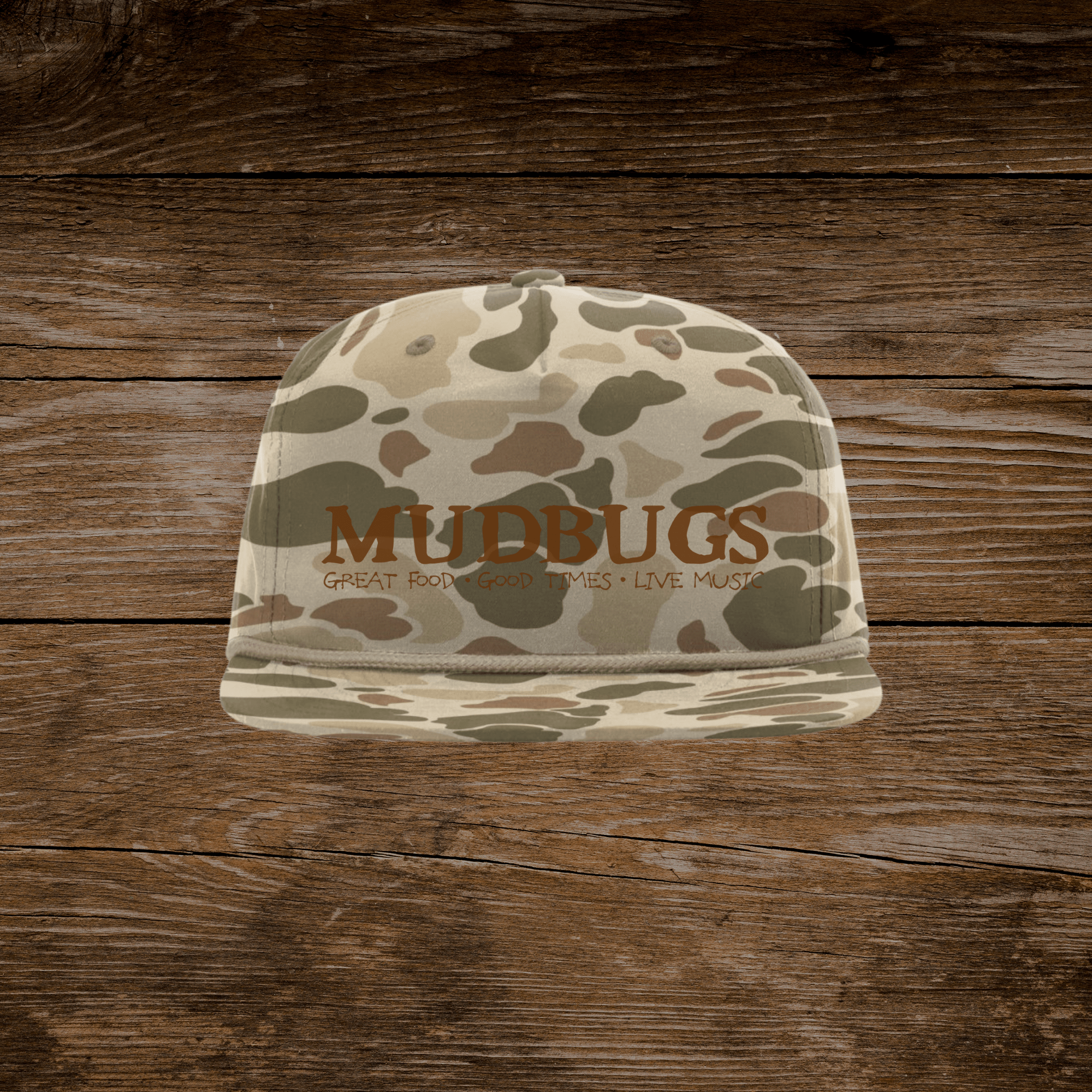 The Mudbugs Harvest Duck Camo Hat is built on the Richardson 256P rope style, known for its structured crown, flat bill, and vintage rope accent detail.